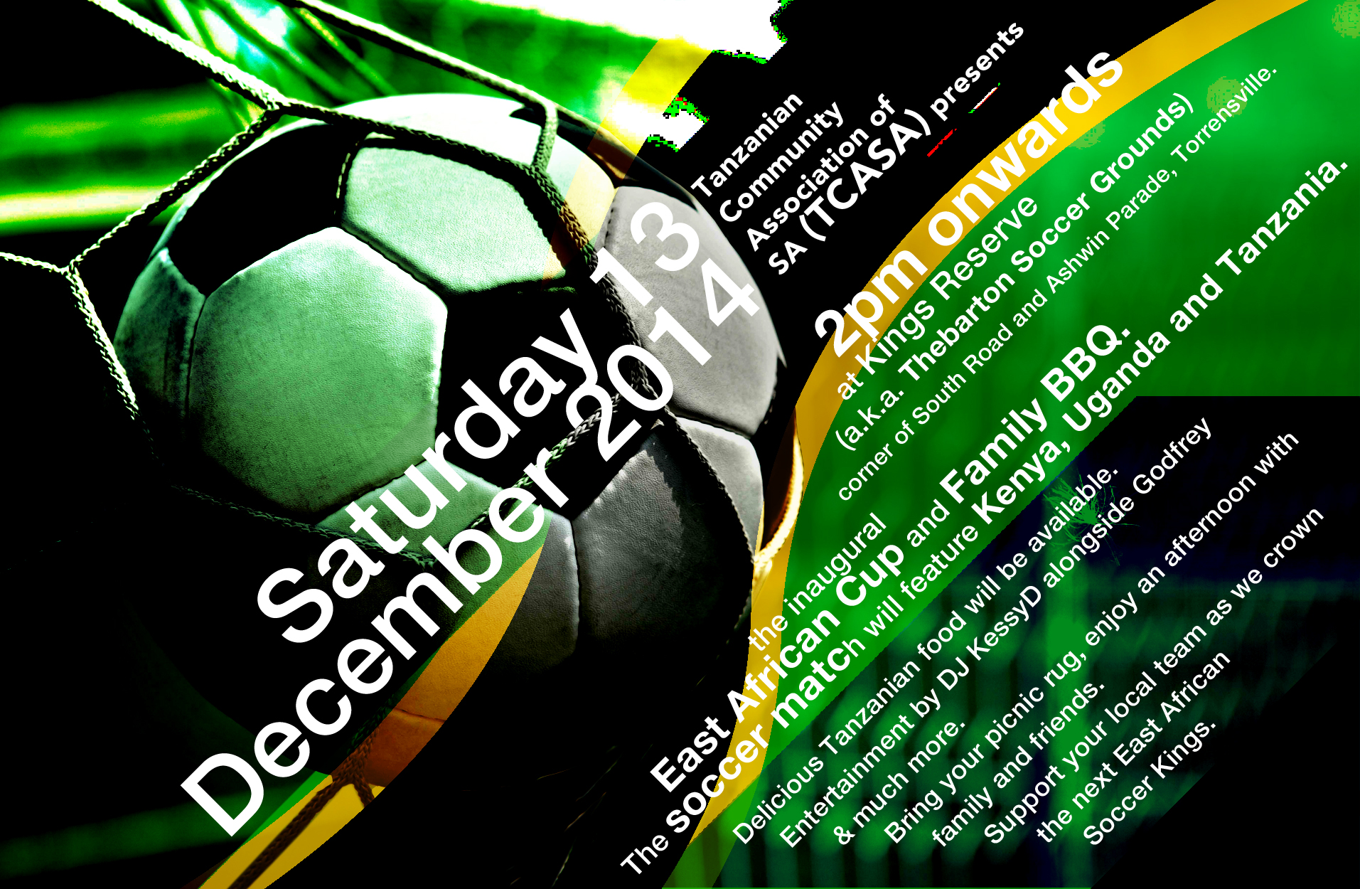 The Tanzanian Community Association of SA would like to invite you to celebrate Tanzanian Independence day with us next Saturday the 13th of December at 2pm at Thebarton Soccer Ground.