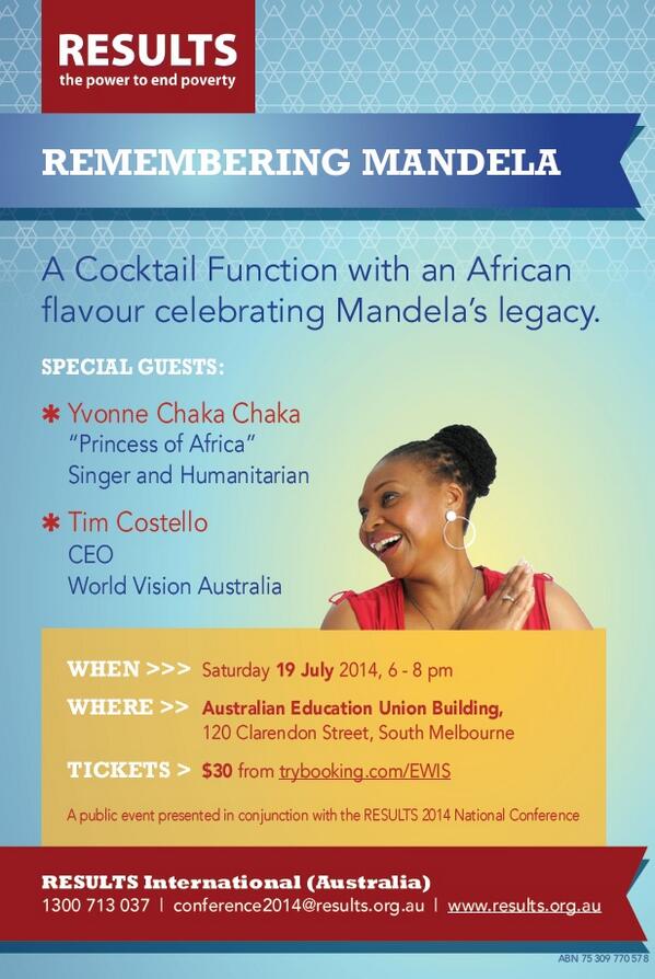 the RESULTS 2014 National Conference) featuring SPECIAL GUESTS: Yvonne Chaka Chaka “Princess of Africa” Singer and Humanitarian and Tim Costello CEO, World Vision Australia.