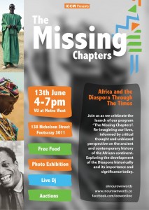 Join in as In Our Own Words celebrate the launch of their program - The Missing Chapters. A three month interactive program that takes its participants through 'the missing chapters' of African history, positioning the diaspora at the centre of dialogue concerning the continent and its many communities scattered around the world. Featuring: + Food + Live Dj + Photo exhibition + Auctions + Many, many more surprises in store!