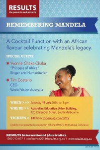 A Cocktail Function with an African flavour celebrating Mandela’s legacy. (A public event presented in conjunction with the RESULTS 2014 National Conference) featuring SPECIAL GUESTS: Yvonne Chaka Chaka “Princess of Africa” Singer and Humanitarian and Tim Costello CEO, World Vision Australia.