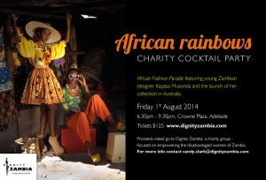 CHARITY COCKTAIL PARTY African Rainbows will be Dignity Zambia's first major fundraiser, supported by Behind Closed Doors. The highlight of the event will be the Australian launch of fashion garments by young Zambian designer Kapasa Musonda, who will travel to Australia for the first time. She won a scholarship to study fashion design in USA and releases her Kalahari range in Los Angeles, USA in 2014. Her designs are outstanding fashion pieces. Kapasa is designing a new collection to bring…