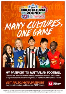 My Passport to Australian Football The AFL and Australia Post are offering people born overseas up to 4 tickets to experience an AFL match during the 2014 Toyota AFL Multicultural Round. Visit afl.to/myaflpassport for more information and to FREE* access tickets!