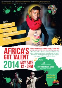 As a part of the Emerge Festival 2014, Africa Day Australian Inc brings you a talent quest, unleashing African Australian creative talents. After state-wide auditions searching for Africa's best talent in Victoria, come and see the top 11 Africa's Got Talent Finalists showcase what they've got as a part of Africa Day Celebrations. Featuring judges: Lamine Sonko (Senegalese Musician) Chris Gill (Northside Records, 3RRR) Stephanie Kabanyana (Visual Artist, Composer, Melbourne Now NGV) Deni Hines (Solo R&B Artist) MCs Abe (Performance…